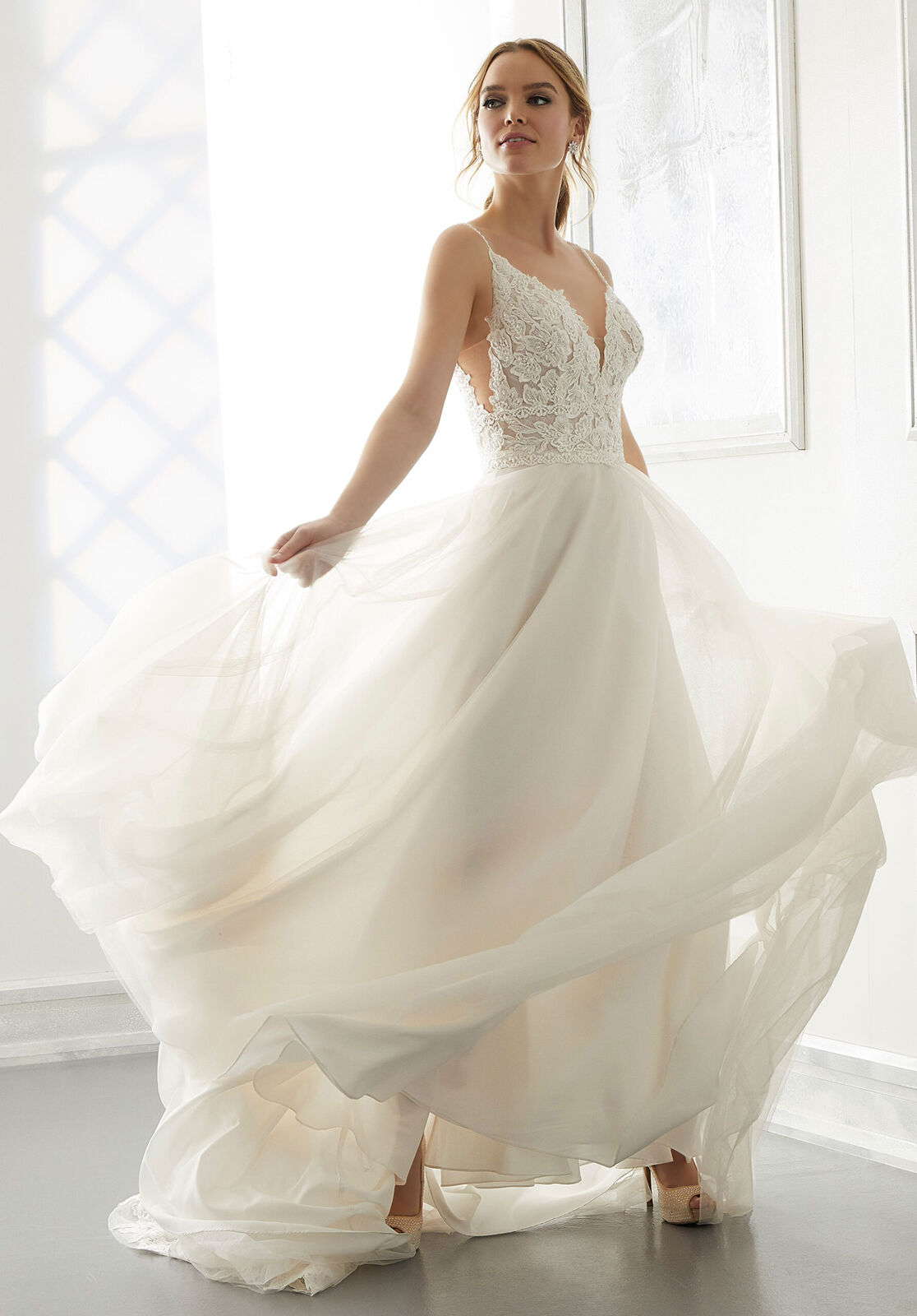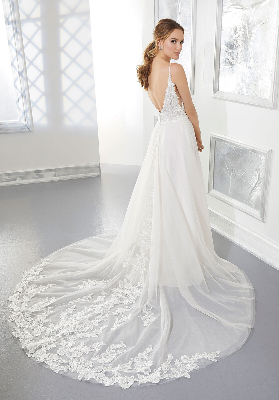 El vestido de novia de corte Autumn presenta un corpiño de encaje con un escote en V profundo, tirantes finos con cuentas, inserciones laterales y una espalda en V abierta. Apliques bordados adornan el corpiño y la cola capilla.