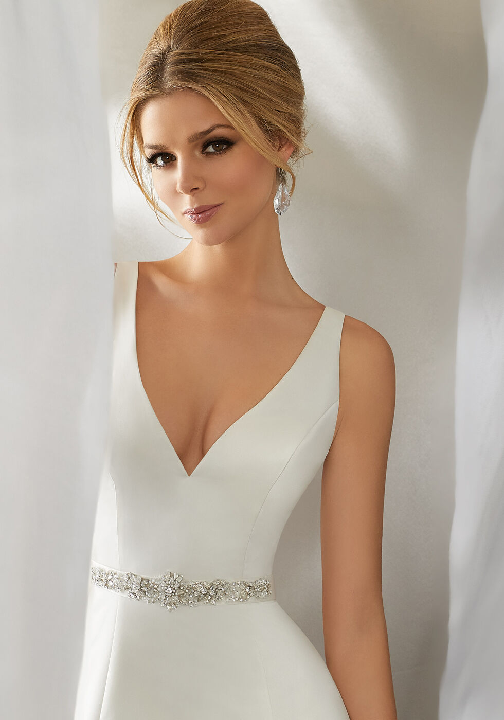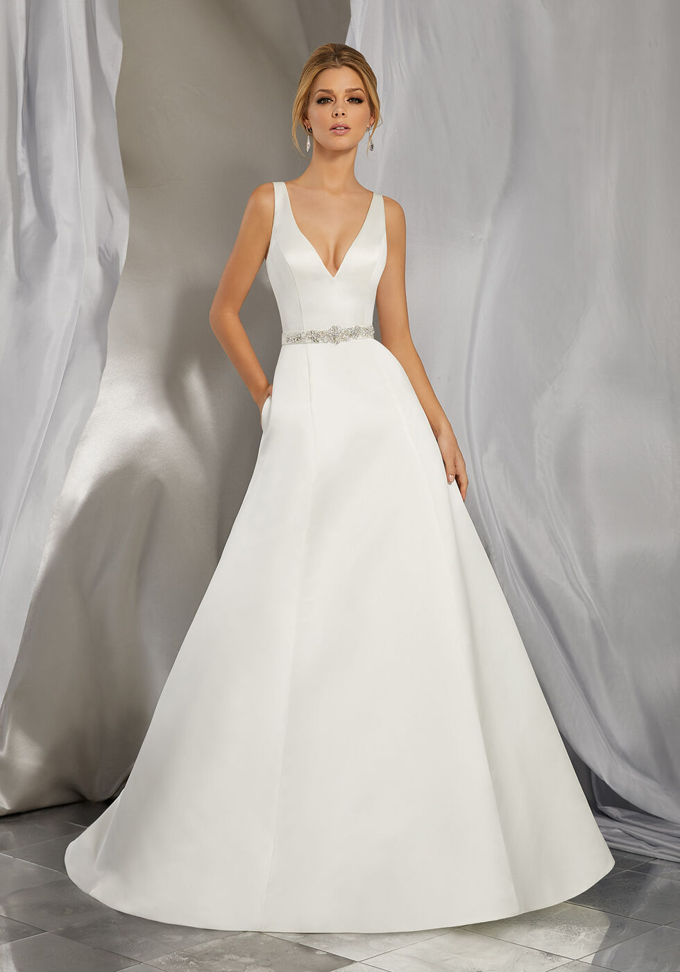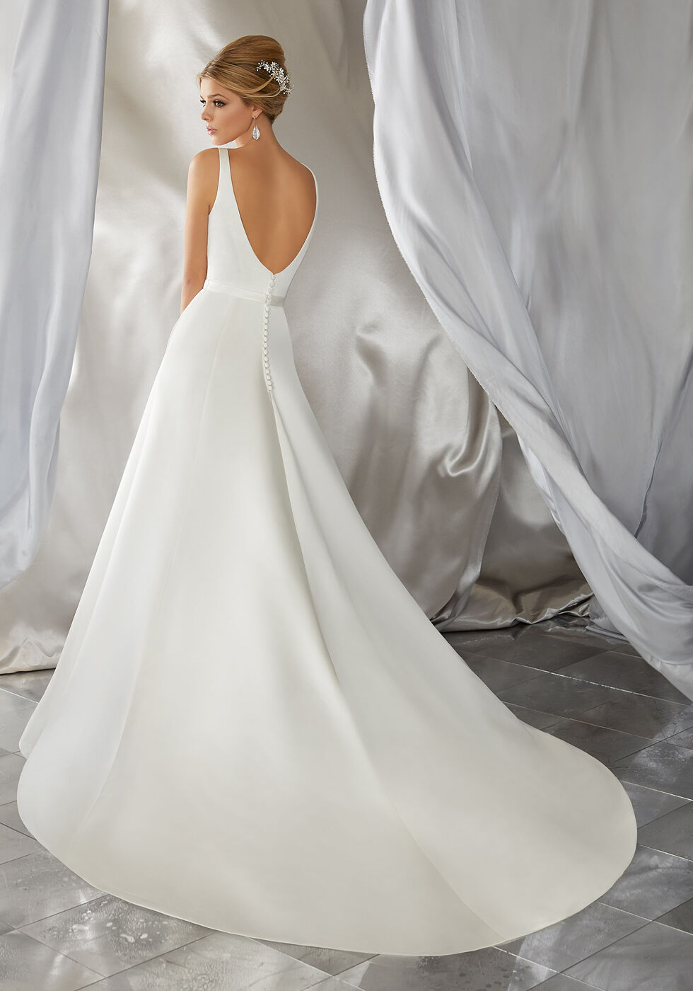 Este vestido de novia presenta una silueta clásica de corte A en satén duquesa, con tirantes finos que enmarcan el pronunciado escote en V y la espalda abierta en V. Las costuras princesa realzan su favorecedor estilo, rematado con bolsillos en costura, botones forrados en la espalda y cola capilla.