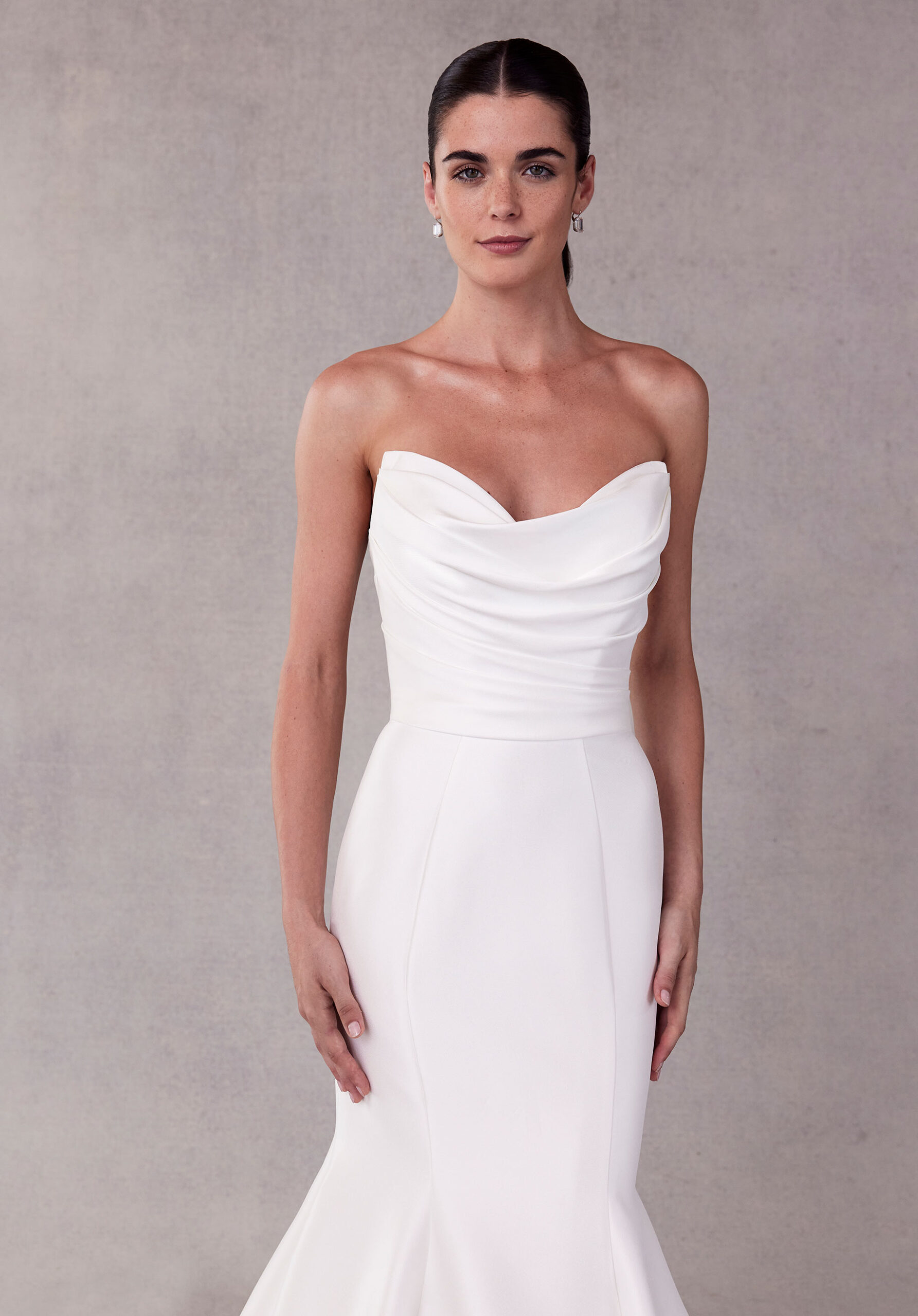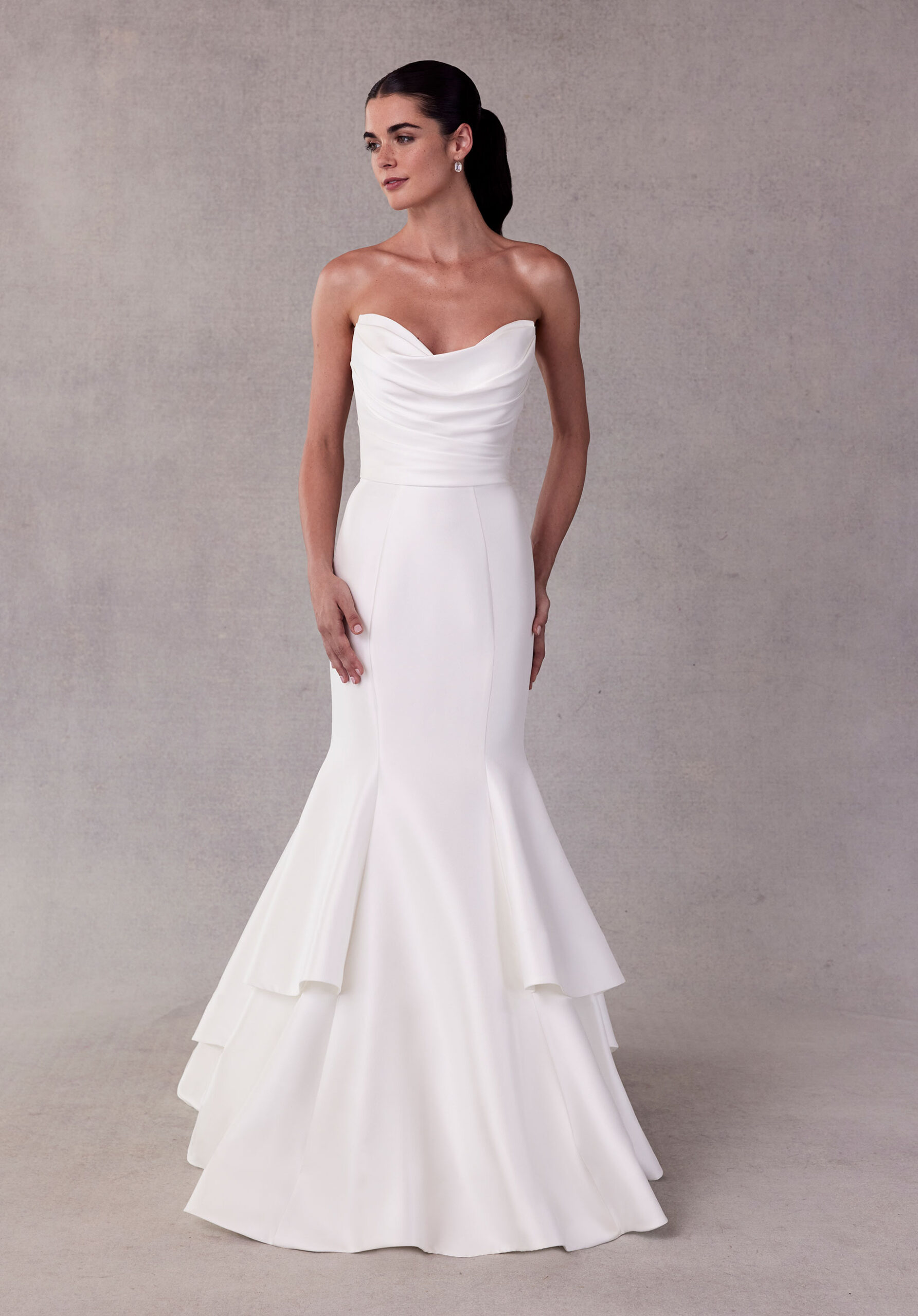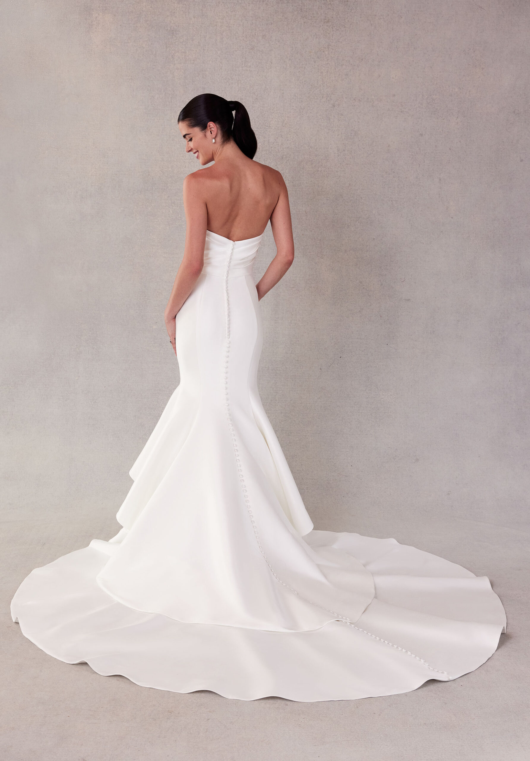 Escote palabra de honor, corpiño drapeado, falda escalonada con vuelo y cola.