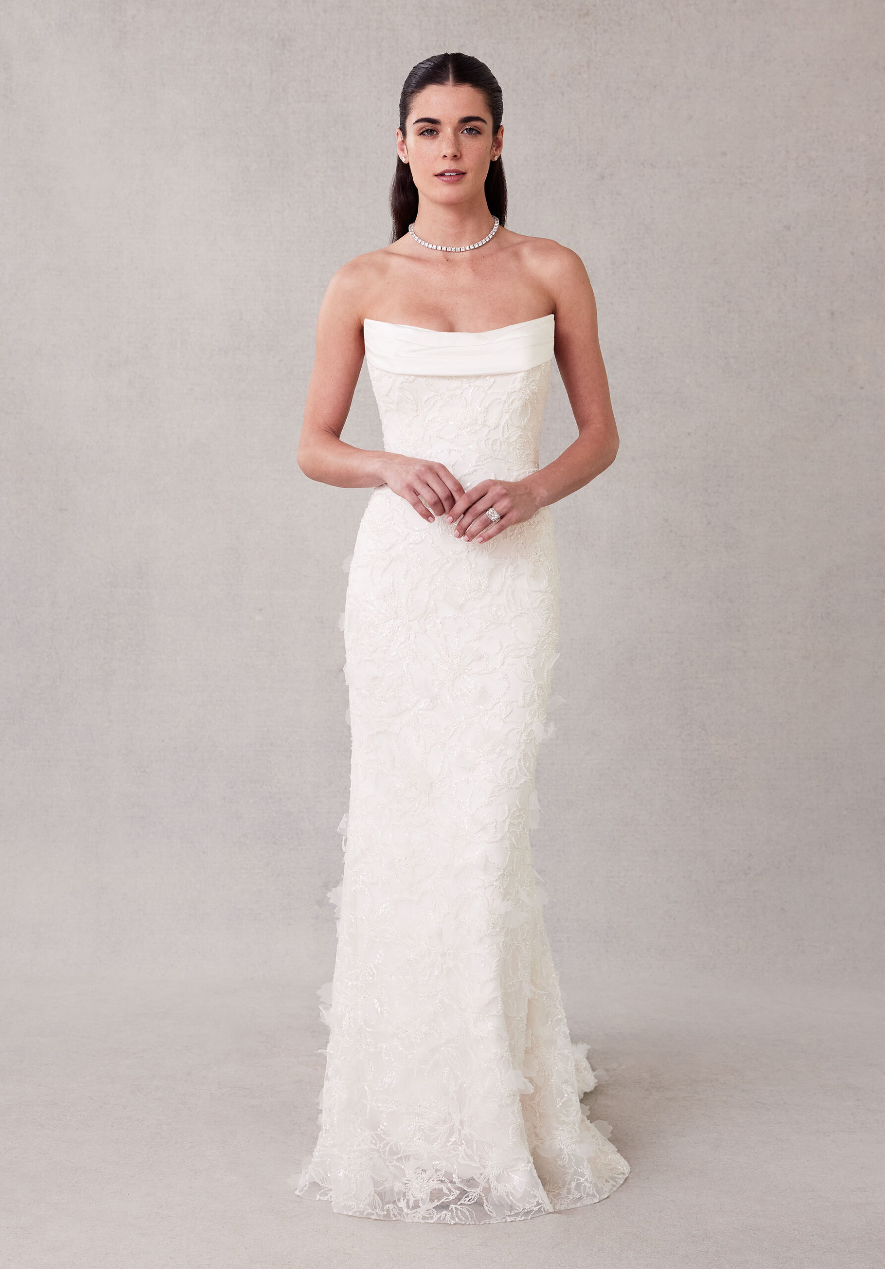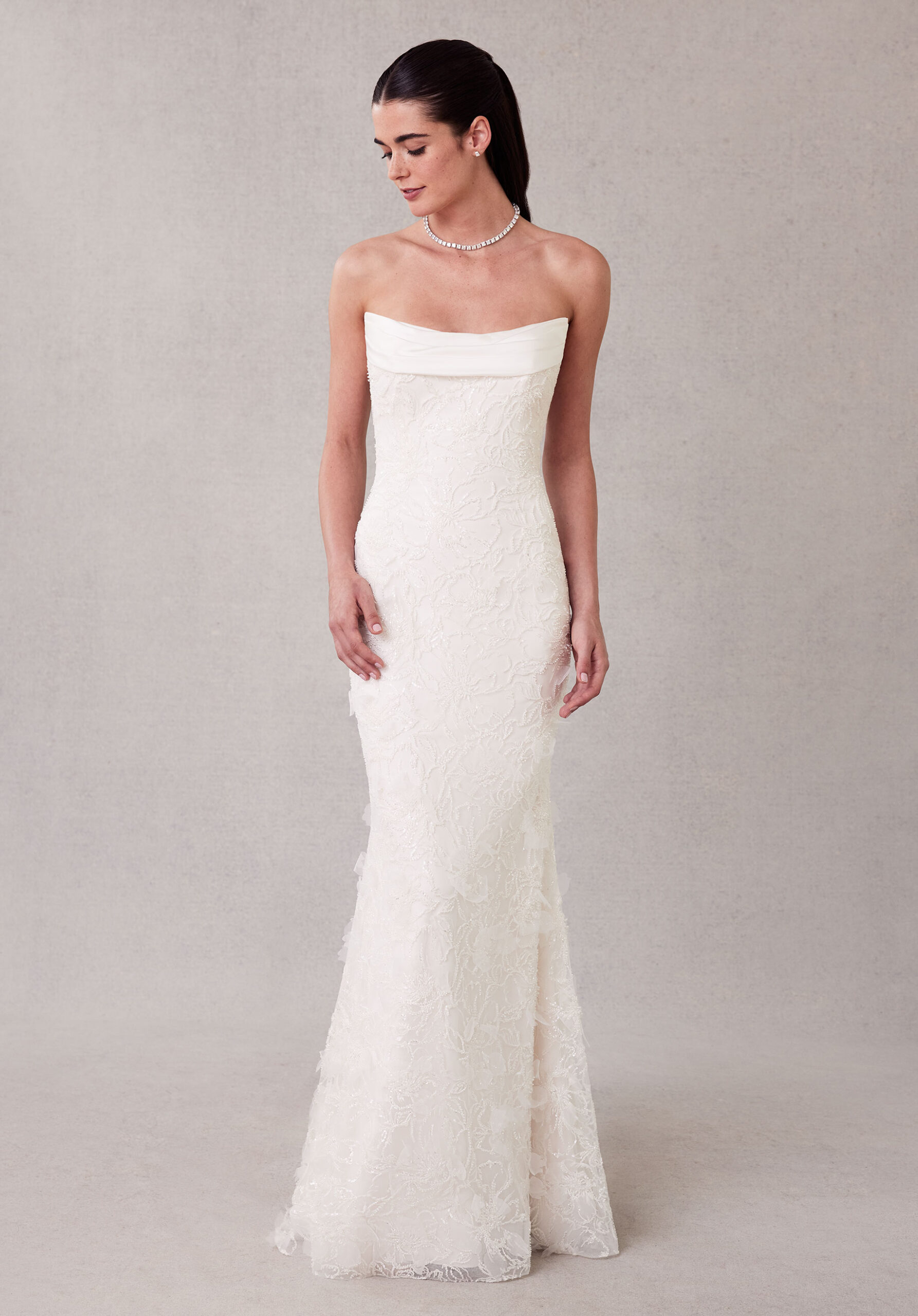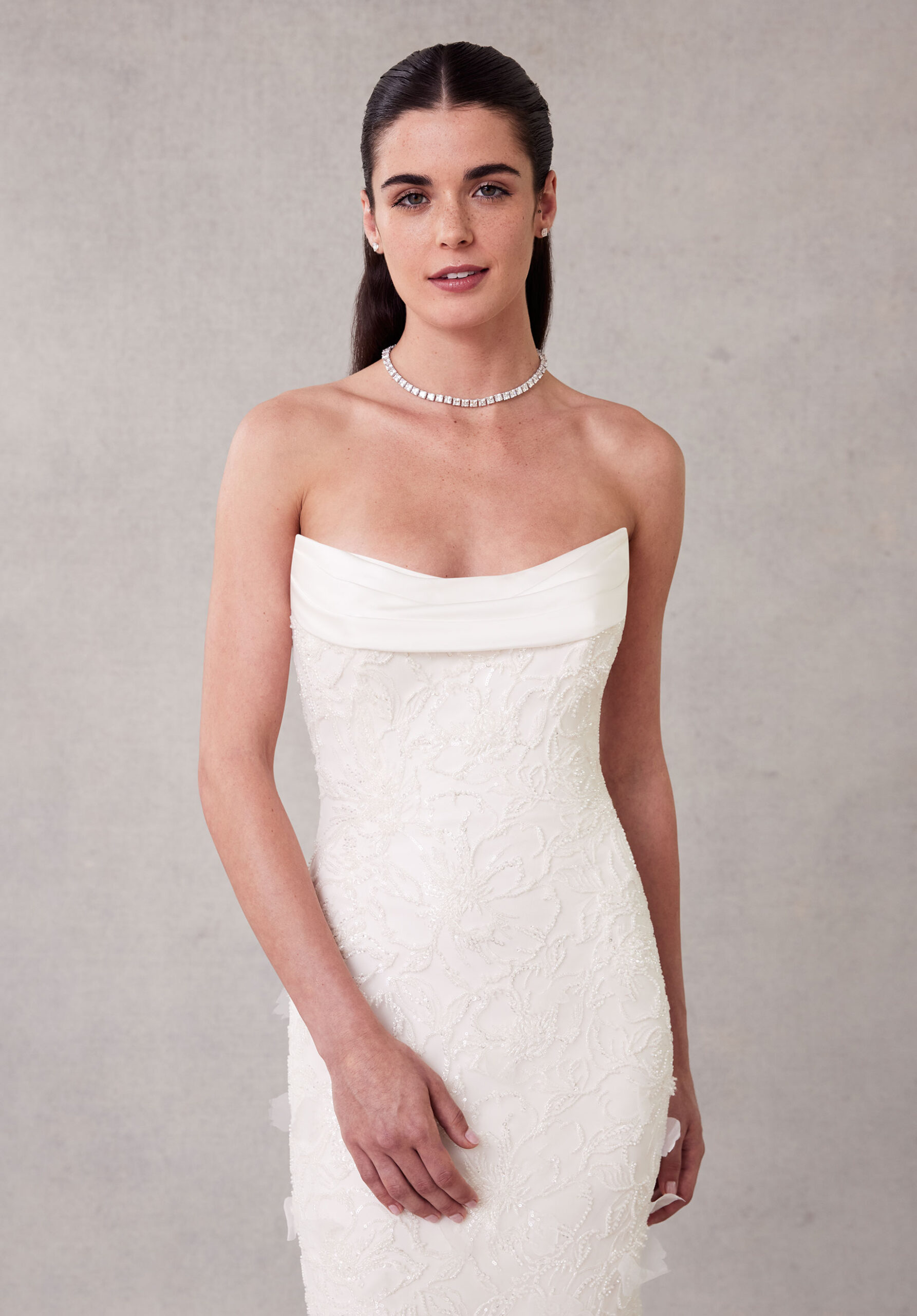 Escote redondo sin tirantes con cuello desbocado de satén suave, red de cuentas con pétalos de organza 3D, vestido ajustado con vuelo y cola.