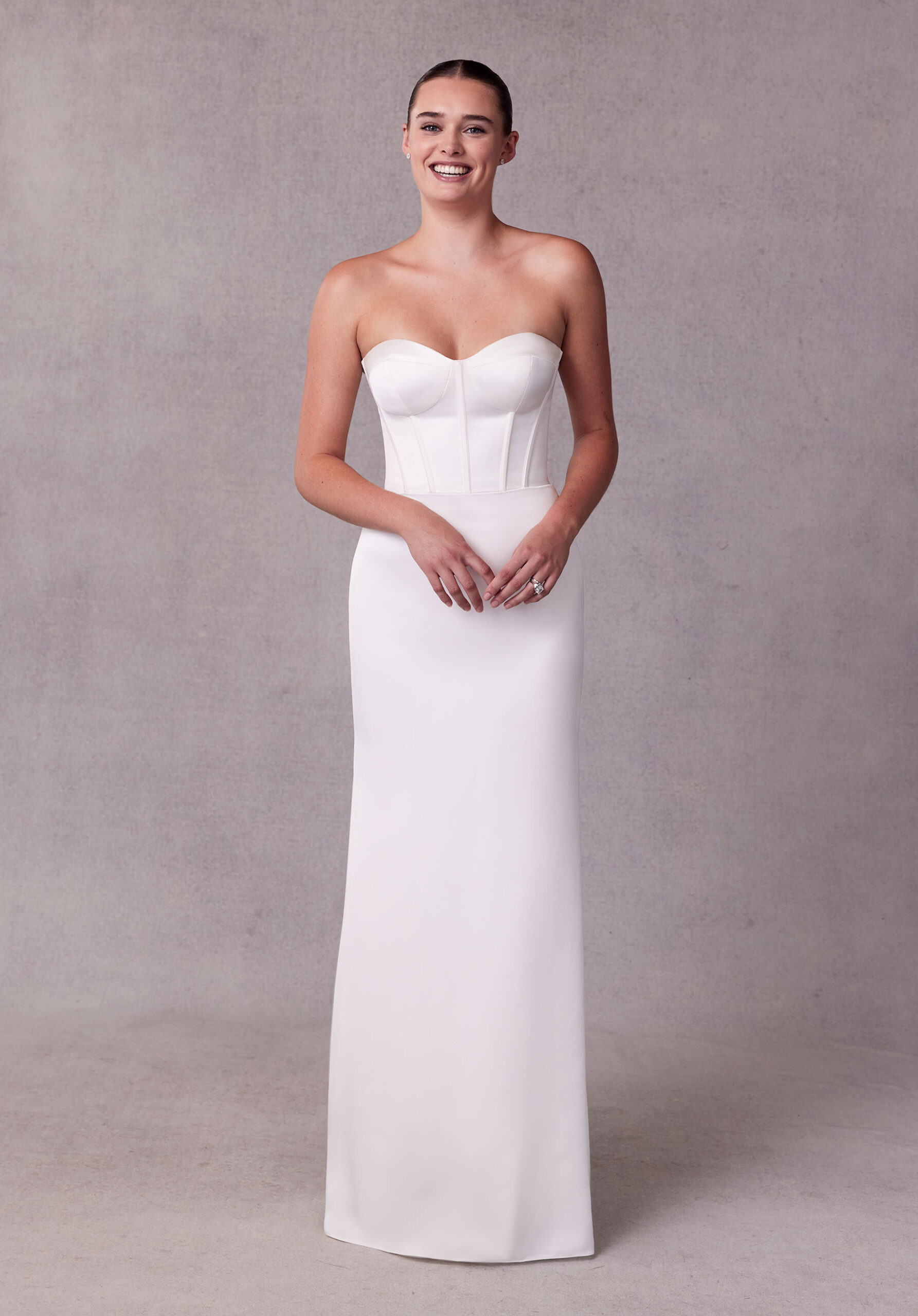 Vestido interior de satén suave con escote corazón sin tirantes y detalle de varillas. Falda ajustada con vuelo y cola.