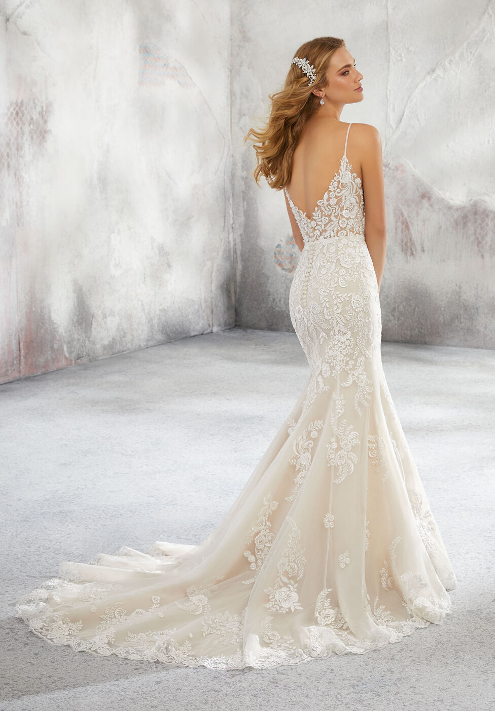 Este hermoso vestido de novia Lunetta de diseño con tirantes finos luce impresionantes cuentas, bordados y apliques en un diseño de red intrincado. el escote en V completa la silueta de este vestido de novia de diseño