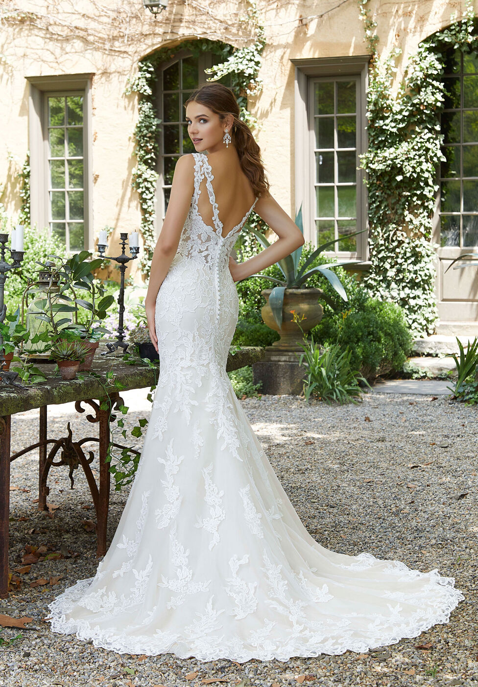Es un diseño impresionante. Con pedrería y cuentas de cristal transparente sobre apliques de encaje alençon esmerilado en un vestido de sirena de tul suave, este look se completa con un dobladillo ancho festoneado y tirantes con apliques. Colores: Blanco, Marfil, Marfil/Almendra (como se muestra en la imagen)
