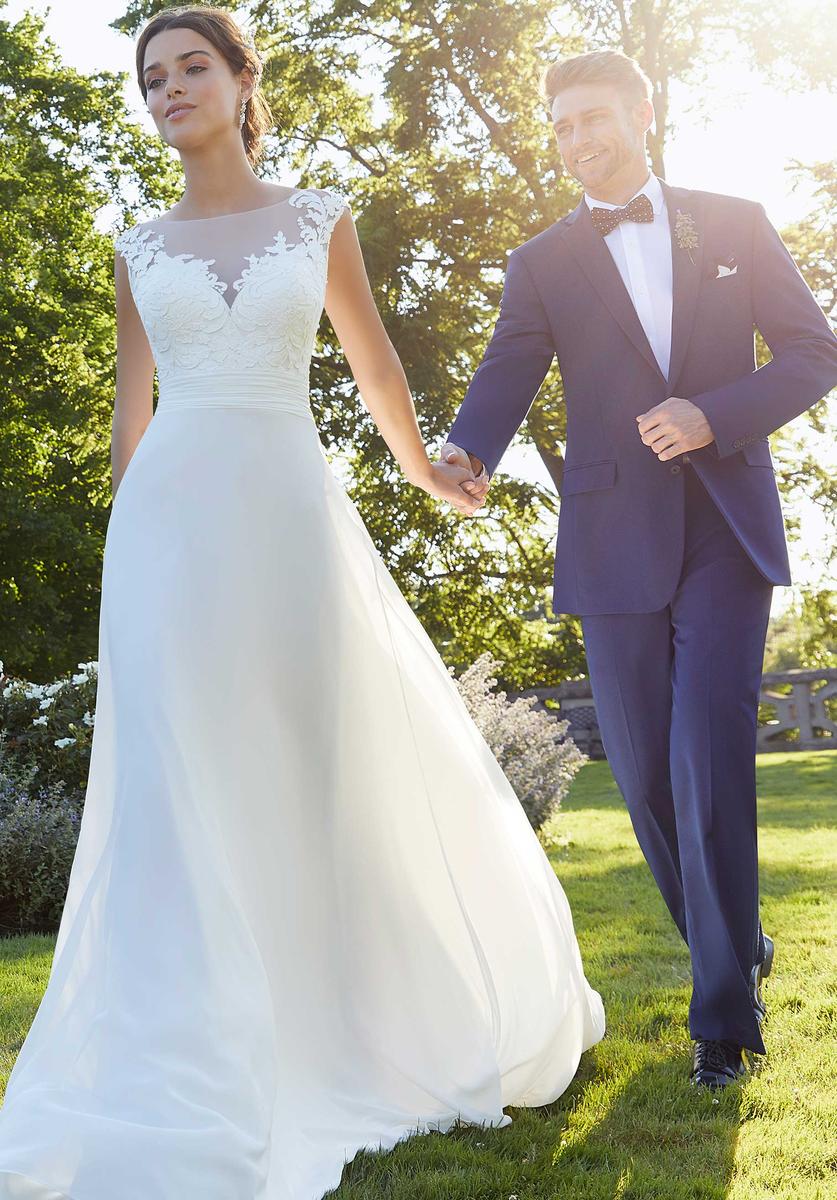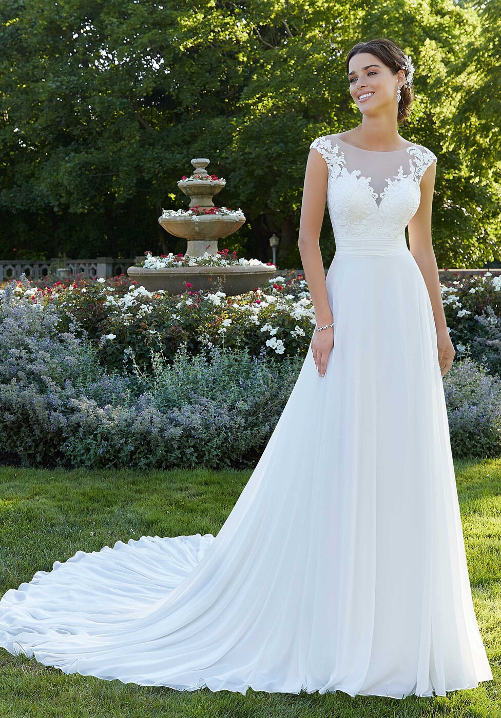 El vestido de novia Sally presenta apliques de encaje sobre un canesú de red transparente con una falda fluida de gasa en forma de A y un abdomen drapeado.