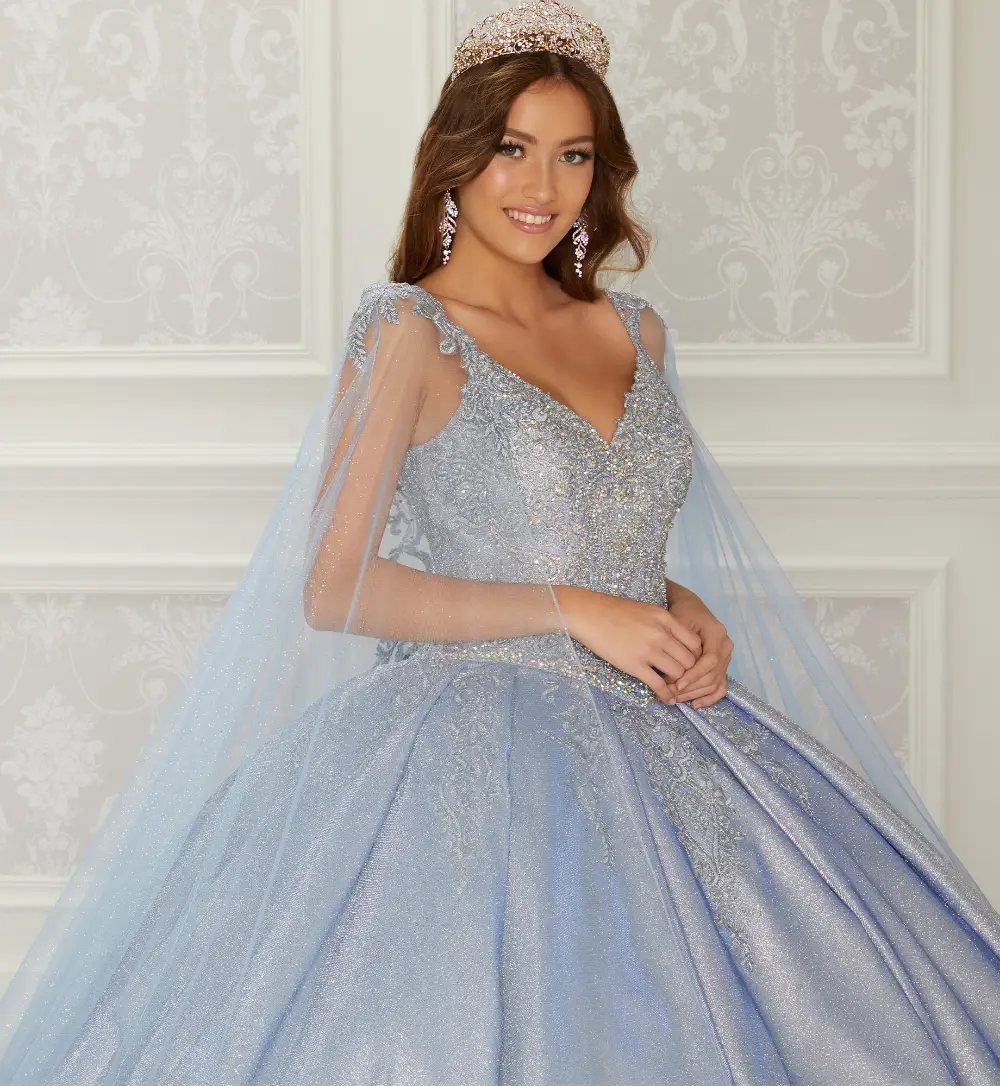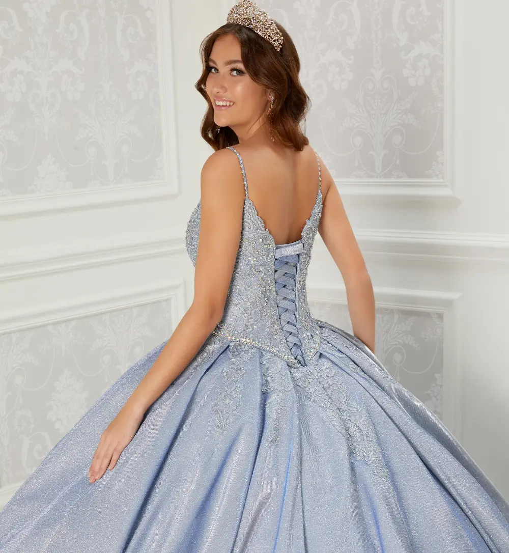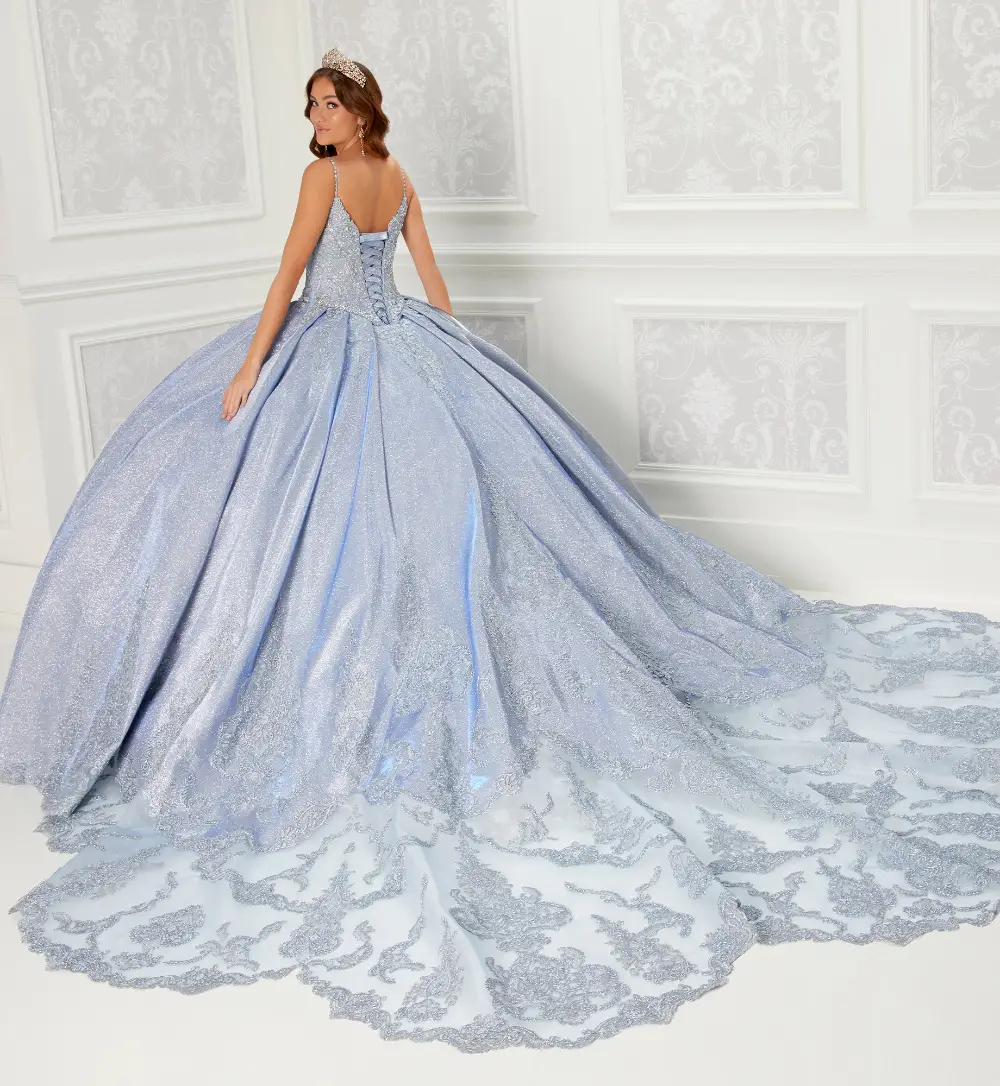 Elegante vestido de gala de encaje bordado con lentejuelas, escote en V, corpiño con cuentas, cintura tipo vasco, espalda tipo corsé, detalles de piedras y cristales, cola catedral con borde festoneado y polisón incorporado.