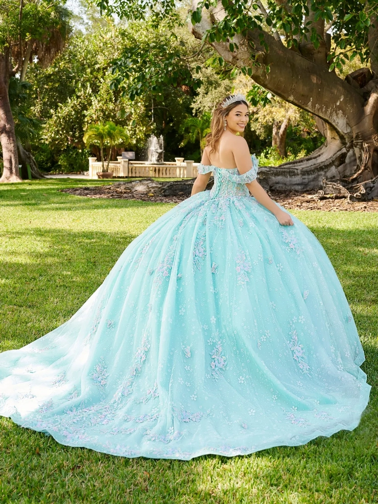 Este vestido de quinceañera de cuento de hadas es la fantasía perfecta para un jardín. Presenta un corpiño con escote corazón adornado con apliques florales tridimensionales en tonos pastel que caen en cascada sobre la falda de tul brillante. Tirantes delicados que envuelven los hombros.