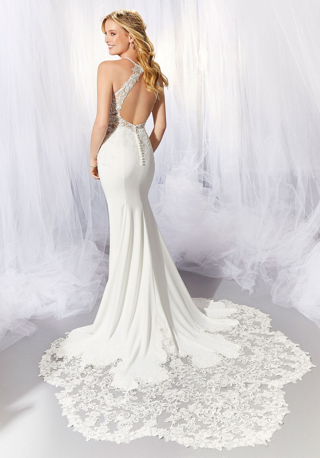 Elegante y sensual, el vestido de novia presenta un corpiño de encaje veneciano transparente sobre encaje Chantilly y una falda ajustada de crepé. El elegante escote halter alto da paso a una impresionante espalda abierta con escote de cerradura. Una intrincada cola de pétalos recortada completa el look.